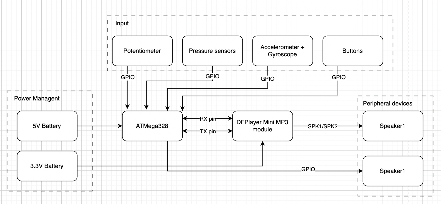 The project will consist of a module that houses the ATmega328PB, speakers, and other core electronic components. There will be a separate component with various drum pads using pressure sensors as well as wristband with the accelerometer/gyroscope.