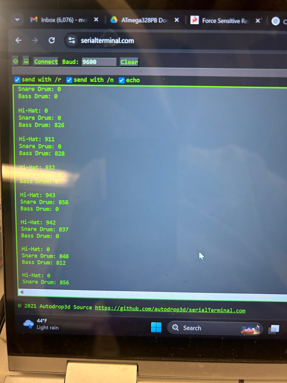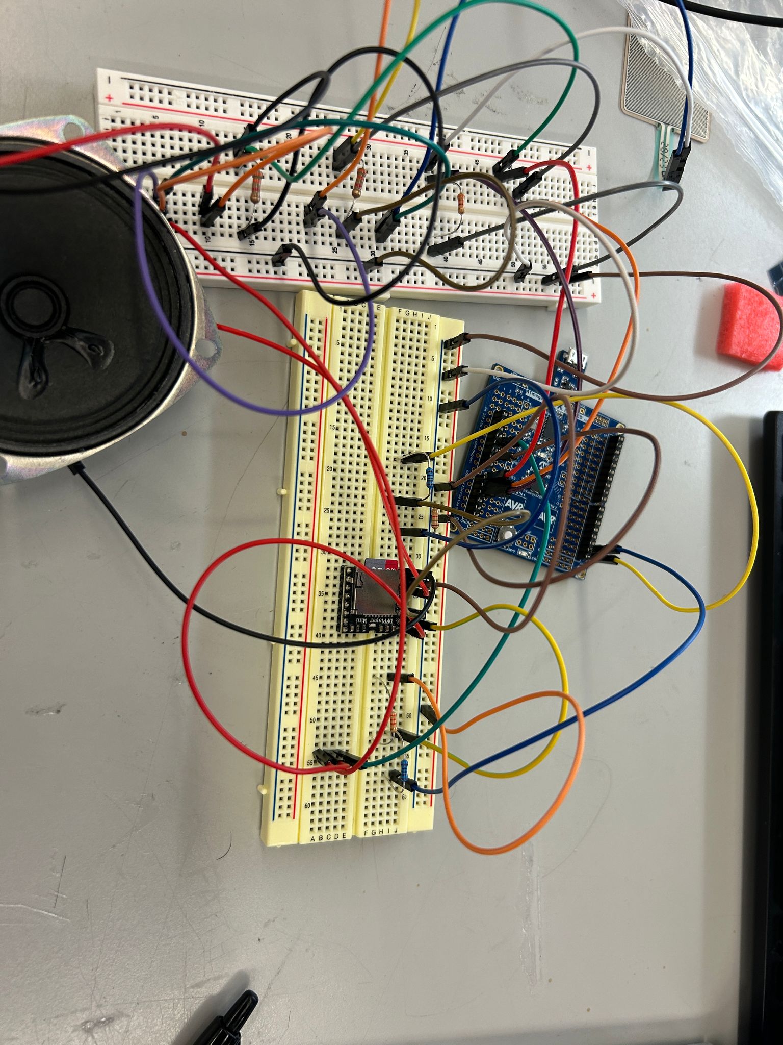For the coming week we are expecting the DFP module to arrive as well as the other parts. First we can finish off the piano part of the project by connecting the speaker to the circuit. We will work on learning how to use the DFP module including uploading MP3 files to it, connecting it to the ATMega328 and connecting our speaker to test output. Once this is working we are going to aim to finish the circuitry set up for the pressure pads for the drum beats and the set up for the gyroscope and accelerometer. Once we can properly read in input then the following week we can work on refining the code. Along with this, we will aim to have a rough draft for our 3D printing.