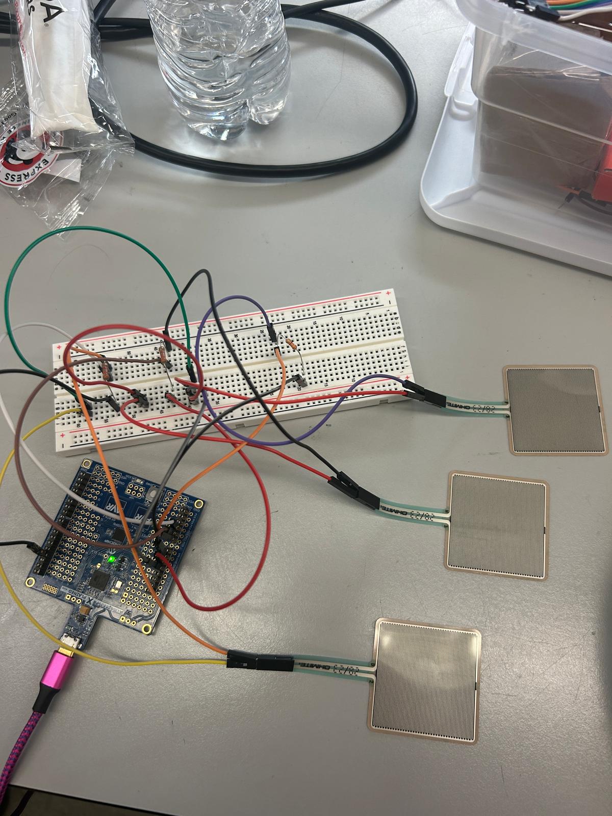 | HRS-01 | The pressure sensors shall carry a maximum load of 1 kg of applied force and measurements above this threshold shall saturate to 1 kg. Connected to a speaker, drum pads attached to the sensors shall mimic sounds of a hi-hat, snare, and bass drum. ADC readings shall change the volume of these sounds according to the pressure applied. |