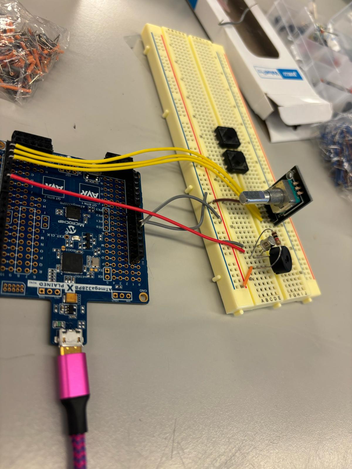 We have built the part of the circuit that will be used for the piano, which controls piano notes and octaves. To control the keys in the octave, we switched from the potentiometer to a rotary encoder. The octave is controlled by 2 buttons that send the octave up or down. For now, the output is connected to a buzzer but when our parts arrive we will be using a speaker instead. We have also ordered parts and are discussing things to work on during the time that parts don’t arrive.