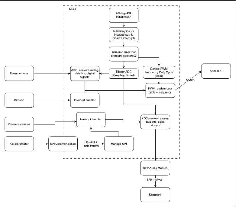 The code for the piano is based on PWM, changing OCR1A and OCR1B according to a range of 8 notes across 4 octaves. The code for the drumset is based on ADC conversion, noting that the complete range of ADC values based on force to the sensor is from 0 to 900. Additionally, the DF Player Module plays music, change volume, and performs other commands through a series of 10 bytes sent one-by-one over UART between the microcontroller. The IMU is powered by an IMU driver consisting of functions that read the accelerometer and the gyroscope.