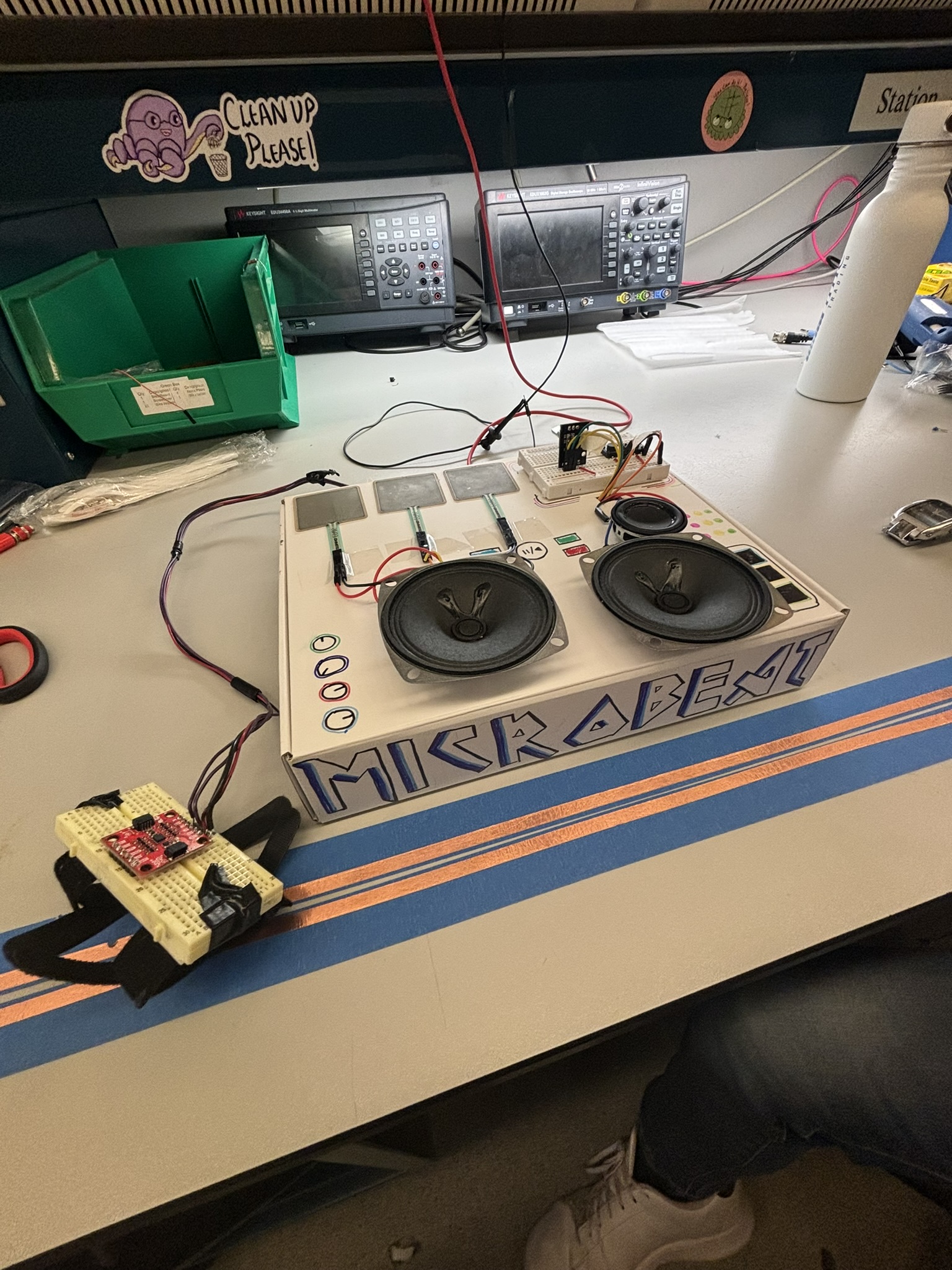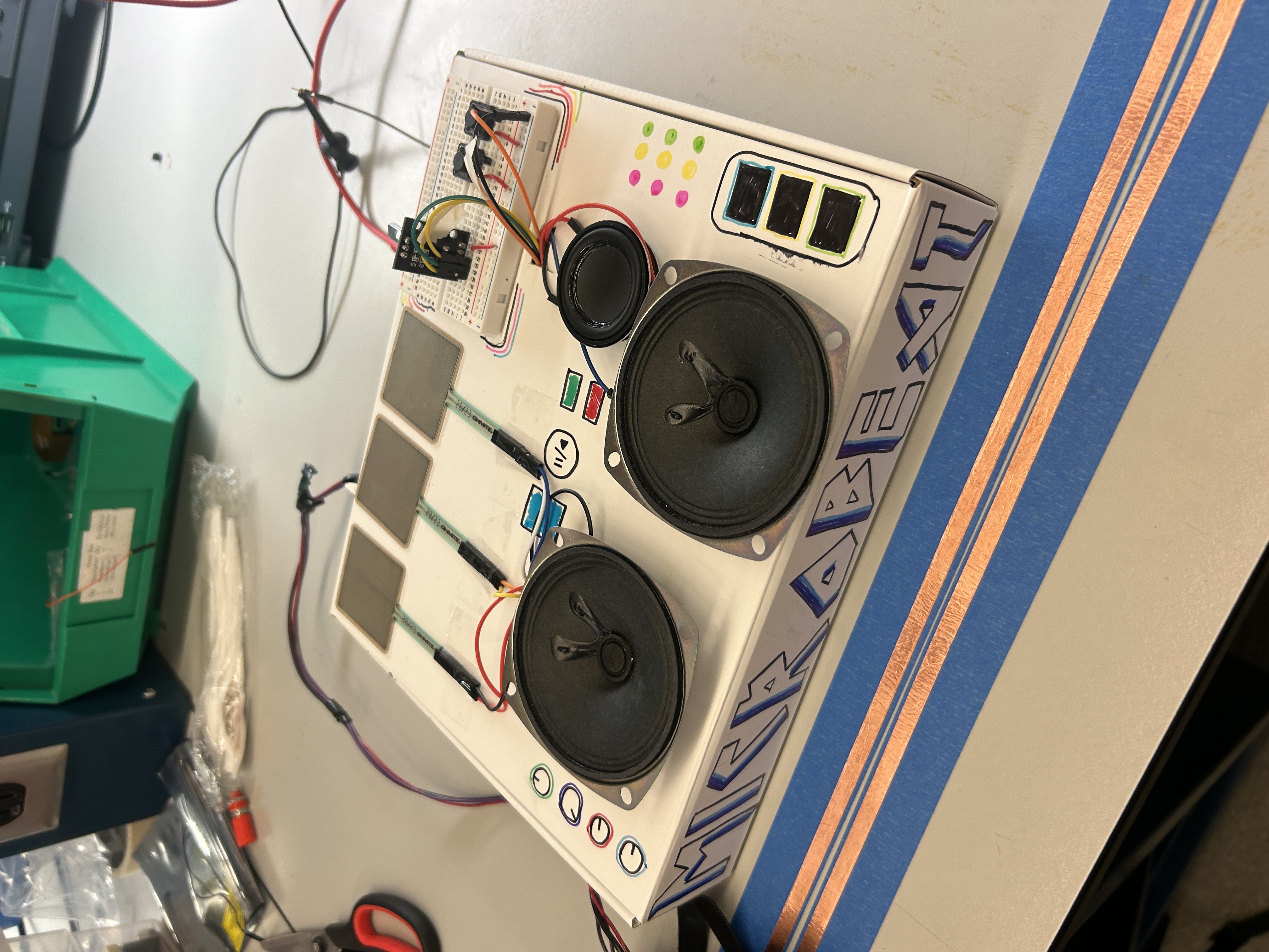 All modules were integrated into a custom-designed, laser-cut enclosure featuring three dedicated speakers—one for each subsystem. The result is a portable, cohesive mini DJ set that unites gesture, pressure, and rotary input to produce a real-time, performative musical experience.